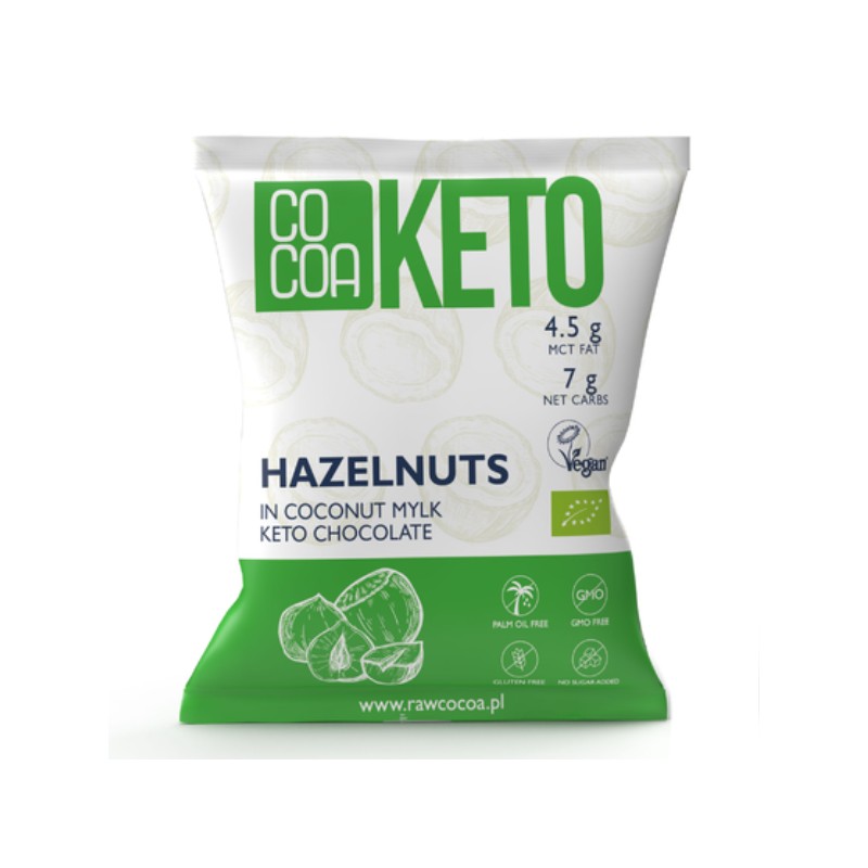 czekolada* 65 % (tłuszcz kakaowy*, substancja słodząca: erytrytol*, sproszkowany miąższ kokosowy* 15 %, inulina*, sproszkowane kakao*, sproszkowany olej MCT z kokosa* (olej MCT z kokosa* 70 %, błonnik z akacji* 30 %), wanilia Bourbon*, lecytyna słonecznikowa* - zawartość masy kakaowej minimum 45 %), ORZECHY LASKOWE* 35 %. (*certyfikowany składnik ekologiczny)