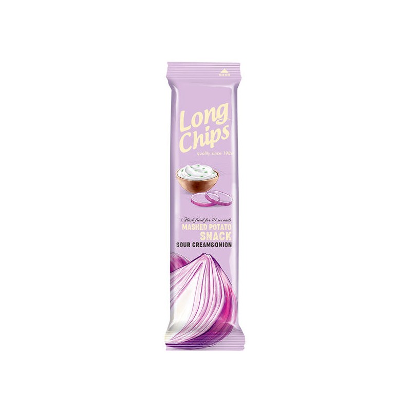 Long Chips Sour Cream & Onion o smaku śmietany i cebulki to wyjątkowe przekąski ziemniaczane. Smażone w wysokiej jakości oleju rzepakowym tylko przez 10 sekund, przez co są niesamowicie chrupkie i nie są tak tłuste jak klasyczne chipsy. Long Chips mają oryginalny kształt - są długie, płaskie i bardzo cienkie. Umieszczone w tacce, aby nie uległy zniszczeniu. Są dostępne w starannie dobranych smakach.